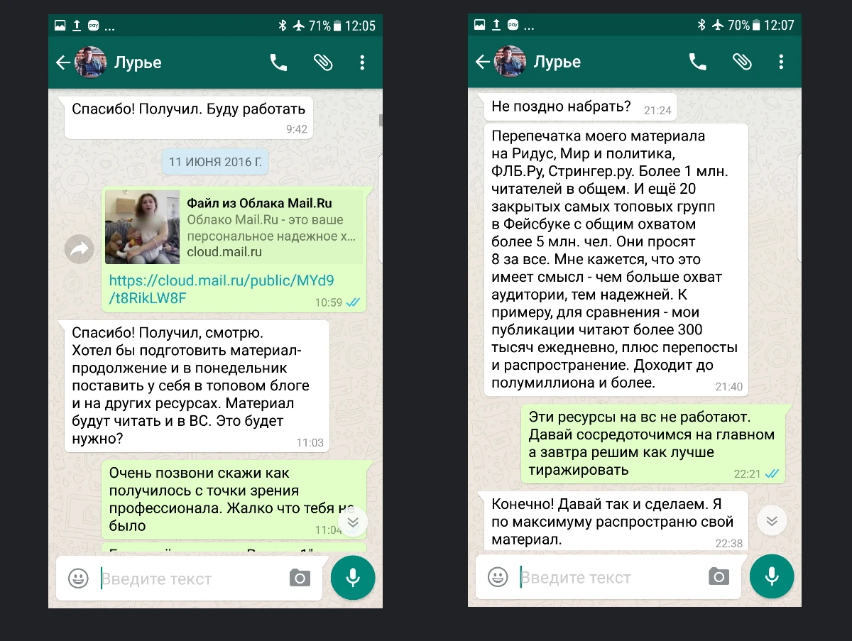 Иногда интересантам приходили такие сообщения: «отправил материал», «по согласованию с тобой везде выставлю, чтобы до суда почитали», «по максимуму распространю», «материал будут читать и в ВС».