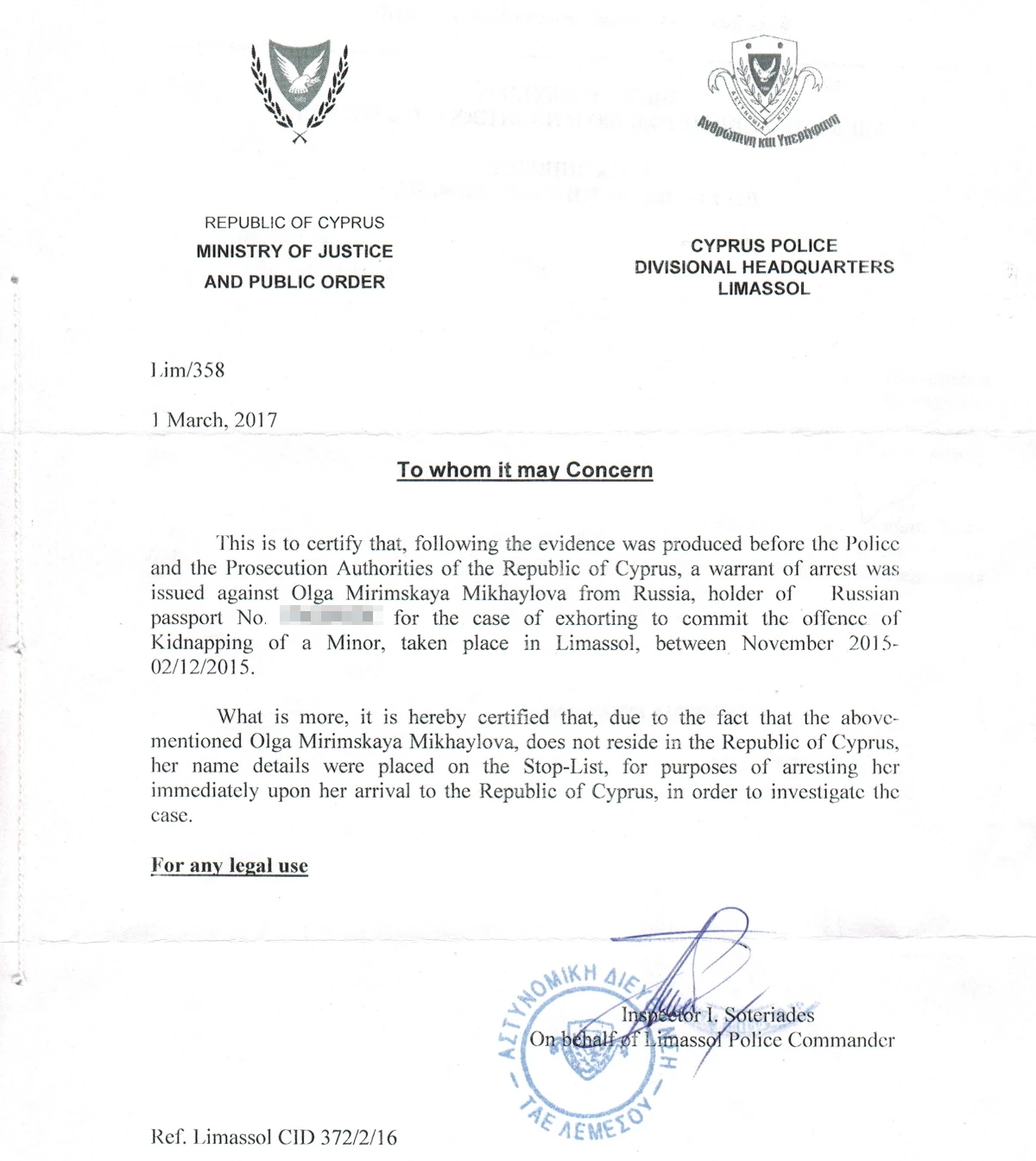 В марте 2017 года полиция Кипра действительно выдала ордер на арест Ольги Миримской. Сегодня она находится в так называемом «стоплисте» и в случае прибытия на остров будет арестована. А прокуратура острова возбудила в отношении российской банкирши уголовное дело о подстрекательстве на совершение преступления — похищение несовершеннолетнего. Остается только гадать, почему подчиненные Александра Бастрыкина уже два года не дают хода заявлениям о преступлении от граждан Кипра, а также показаниям соучастника «стамбульской операции».