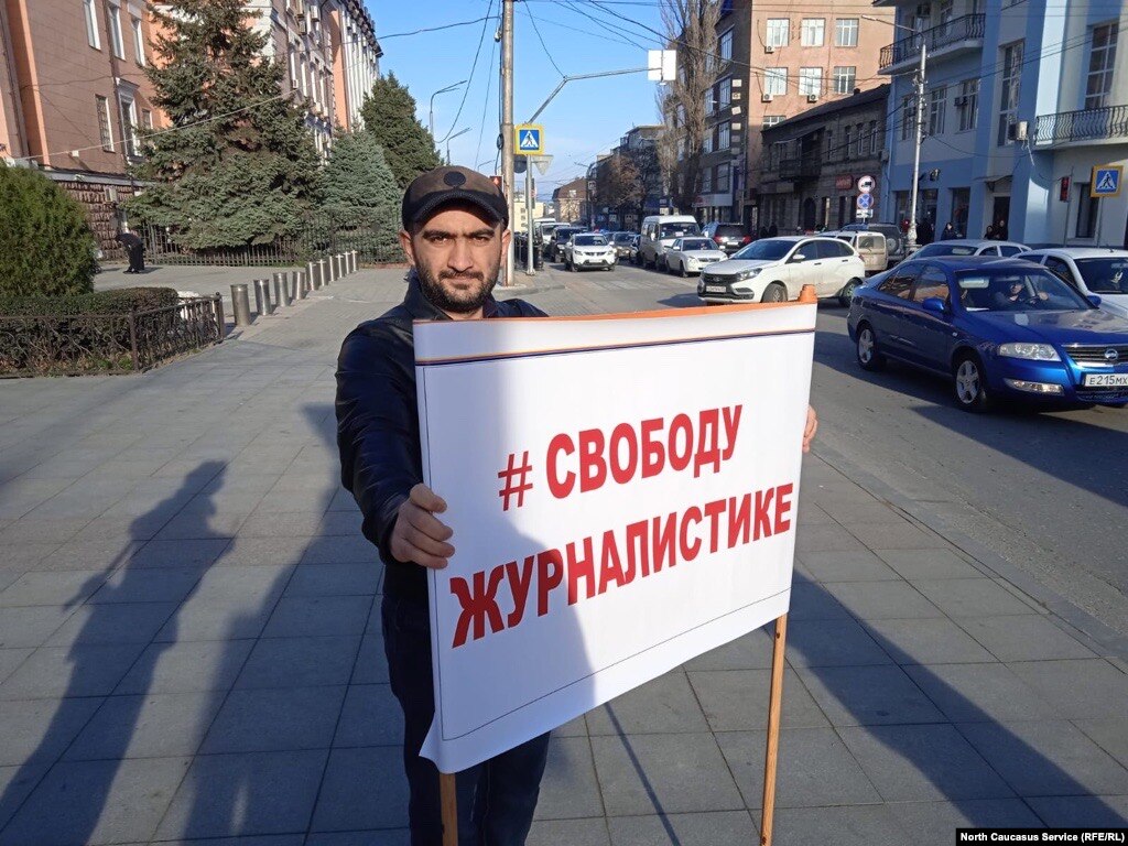Участник пикета, дагестанский журналист Мурад Мурадов стоял с плакатом "Свободу журналистике".