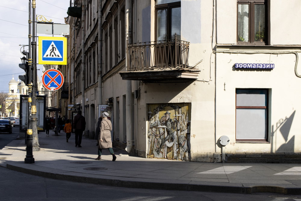 Начнем с угла Дон Кихота на пересечении Моховой и Пестеля. Знаменитого рыцаря из романа Сервантеса нарисовал художник Кирилл Ведерников: не заметить его работу, проходя мимо, практически невозможно.