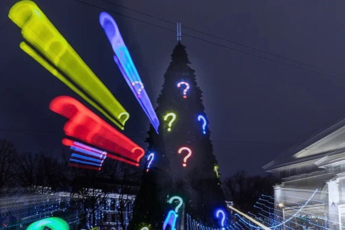 Елку у Манежа украсили знаками вопроса от художницы Аси Маракулиной