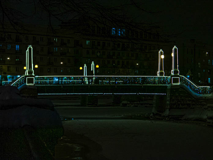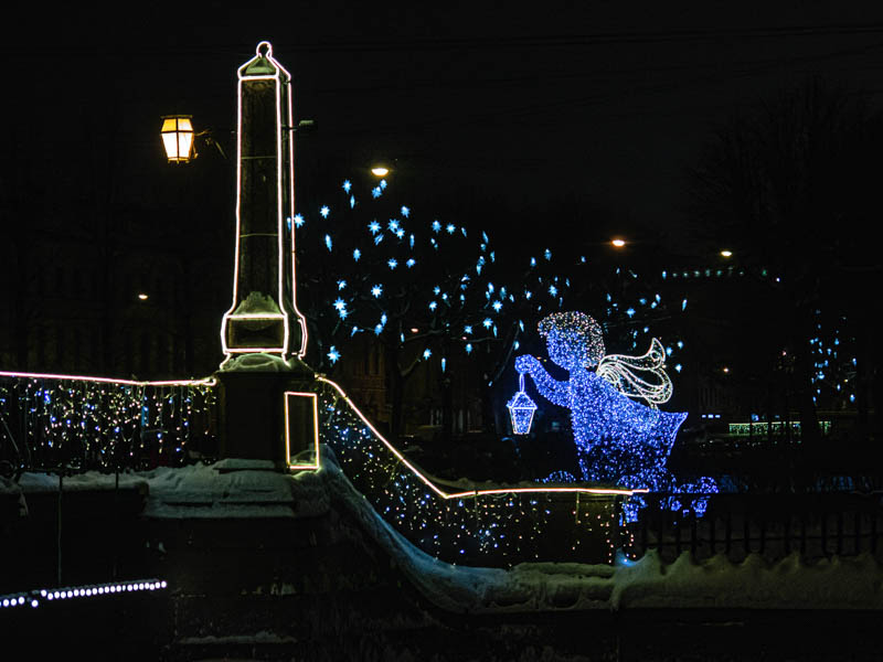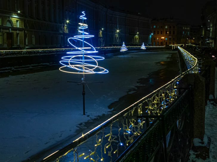 В акватории Крюкова канала и Мойки установили световые инсталляции в виде елок, на Большой Конюшенной поставили световую арку. На оформление Мойки потратили более 18 миллионов рублей. А на набережной канала Грибоедова от Банковского моста до Конюшенной площади установили световую композицию «Северное сияние» за 19 миллионов — похожая инсталляция годом ранее появилась над Дворцовым мостом.