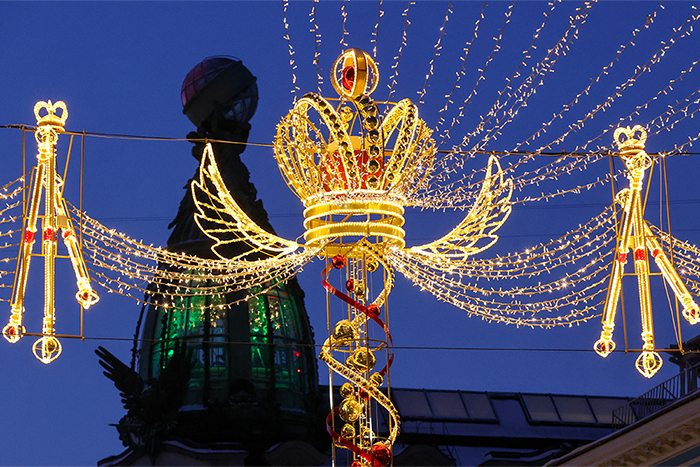 На Невском проспекте впервые за семь лет поменяли праздничную иллюминацию. Там появились украшения в виде имперских корон — в честь 350-летия со дня рождения Петра I. Согласно данным портала госзакупок, оформление обошлось Петербургу в 27 миллионов рублей.
