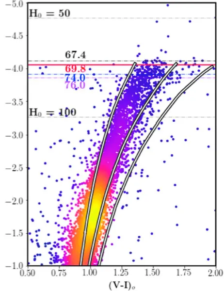 Недавно (в сентябре) вышла еще одна важная статья Венди Фридман [3], где она калибрует сверхновые совершенно другим способом. Она использовала красные гиганты — последнюю стадию эволюции звезд типа Солнца. У красных гигантов есть предельная яркость (вершина ветви красных гигантов), она определяется физикой горения звезд и прекрасно видна на диаграмме Герцшпрунга — Рассела (рис. 1).