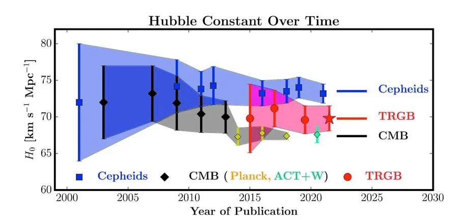 Фридман использовала калибровку ветви красных гигантов Большого Магелланова Облака и применила ее аналогично цефеидам к определению светимости сверхновых. Ее результат ниже, чем у группы Рисса: 69,8 ± 1,9 км/с/Мпк — это больше, чем значение команды «Планка», но не противоречит ему. Она высказывает то же мнение, что и Олег Верходанов: однозначно говорить о необходимости ревизии модели ΛCDM нельзя, так как, возможно, существует еще не понятая систематика в калибровке цефеид. Эволюция результатов измерения постоянной Хаббла представлена на рис. 2.