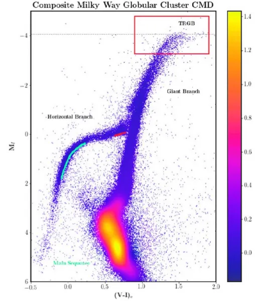 Рис. 1. Панель а — диаграмма Герцшпрунга — Рассела для шаровых скоплений, входящих в состав нашей Галактики. Метка TGRB (Tip of the Red Giant Branch) обозначает вершину ветви красных гигантов, использованную для калибровки.