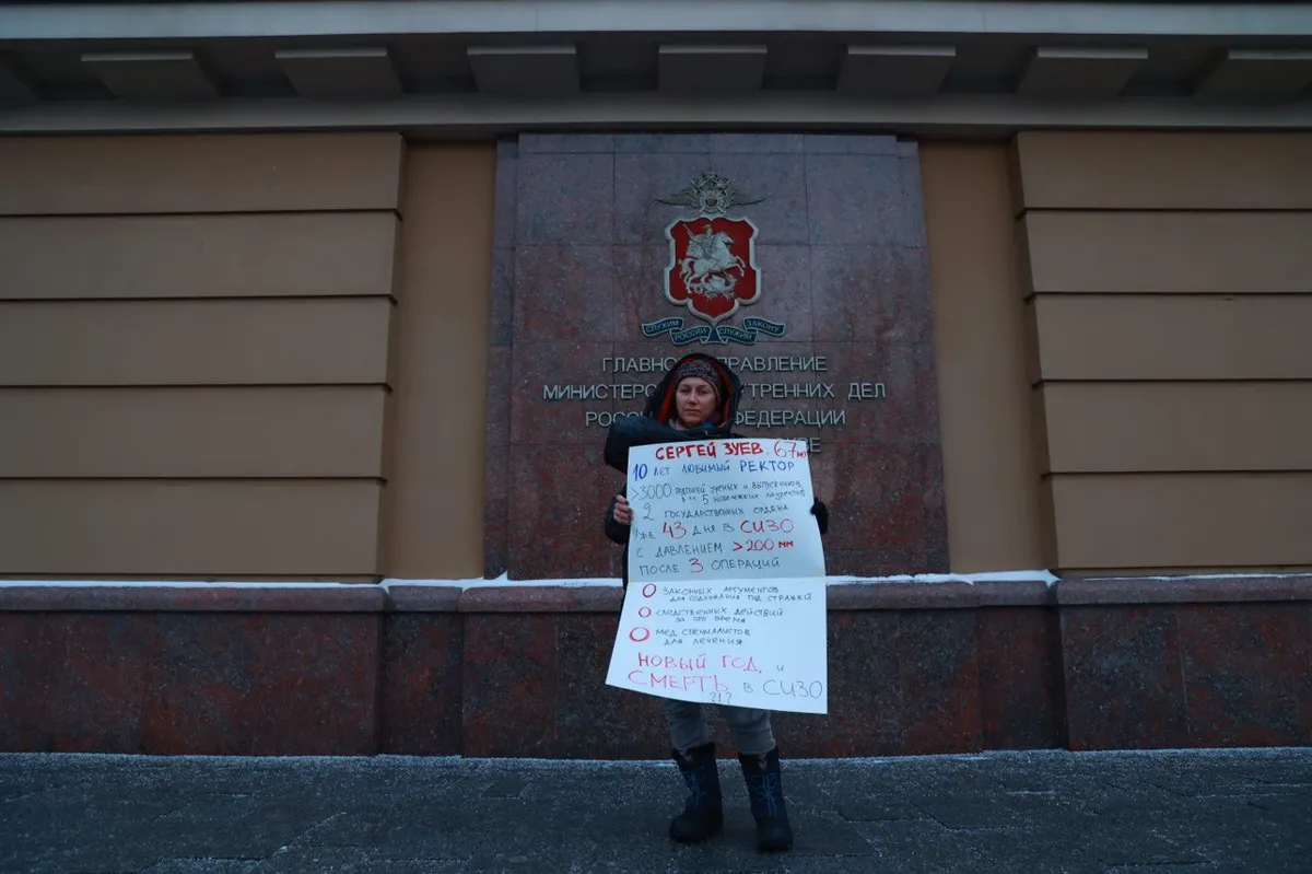 Дочь арестованного ректора Московской высшей школы социальных и экономических наук (Шанинка) Сергея Зуева Дарья вышла на пикет к зданию ГУ МВД на Петровке 38. Накануне Мосгорсуд отклонил жалобу защиты и оставил 67-летнего Зуева в СИЗО, несмотря на то, что ранее врачи заявили, что у него есть риск наступления инсульта и ампутации конечностей.