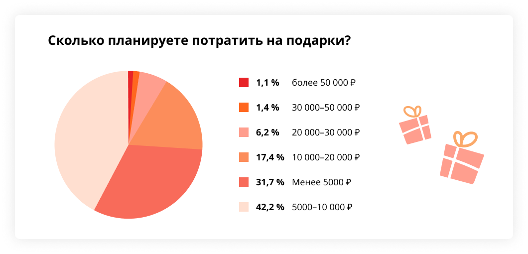 Что касается конкретных сумм, то больше трети респондентов планируют израсходовать на презенты от 5 до 10 тысяч рублей.