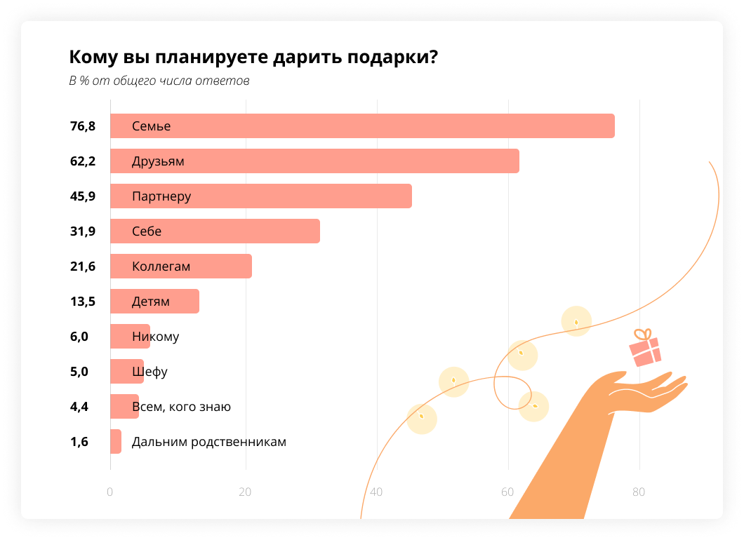 Самая популярная категория людей, которой респонденты собираются дарить новогодние подарки, — это семья. В топ-3 также вошли друзья и партнеры. Примечательно, что подарки для себя также пользуется популярностью.