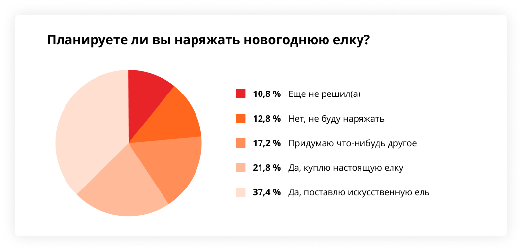 Больше трети респондентов собираются ставить искусственную елку, а пятая часть опрошенных — живое дерево. На третьем месте по популярности вариант использовать альтернативу — например, еловые ветки в вазе.