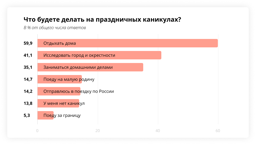 Что касается активностей на праздничных выходных, больше половины опрошенных указали, что будут отдыхать дома. Еще 41 % опрошенных планирует исследовать город и окрестности, а 35 % собираются взяться за домашние дела и, может быть, сделать ремонт.
