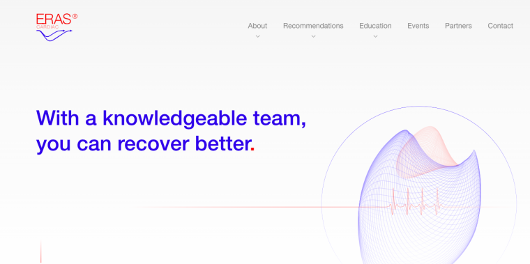 Пожалуй, одна из немногих отраслей, позволяющих себе самобытность, — это медицина. На сайте организации ERAS мы видим и свою особенную палитру и несколько выбившуюся технологичность в оформлении. Сайт выглядит как будто несколько менее современным, хотя и привлекательным. Но зато он точно переключает внимание посетителей на содержание.
