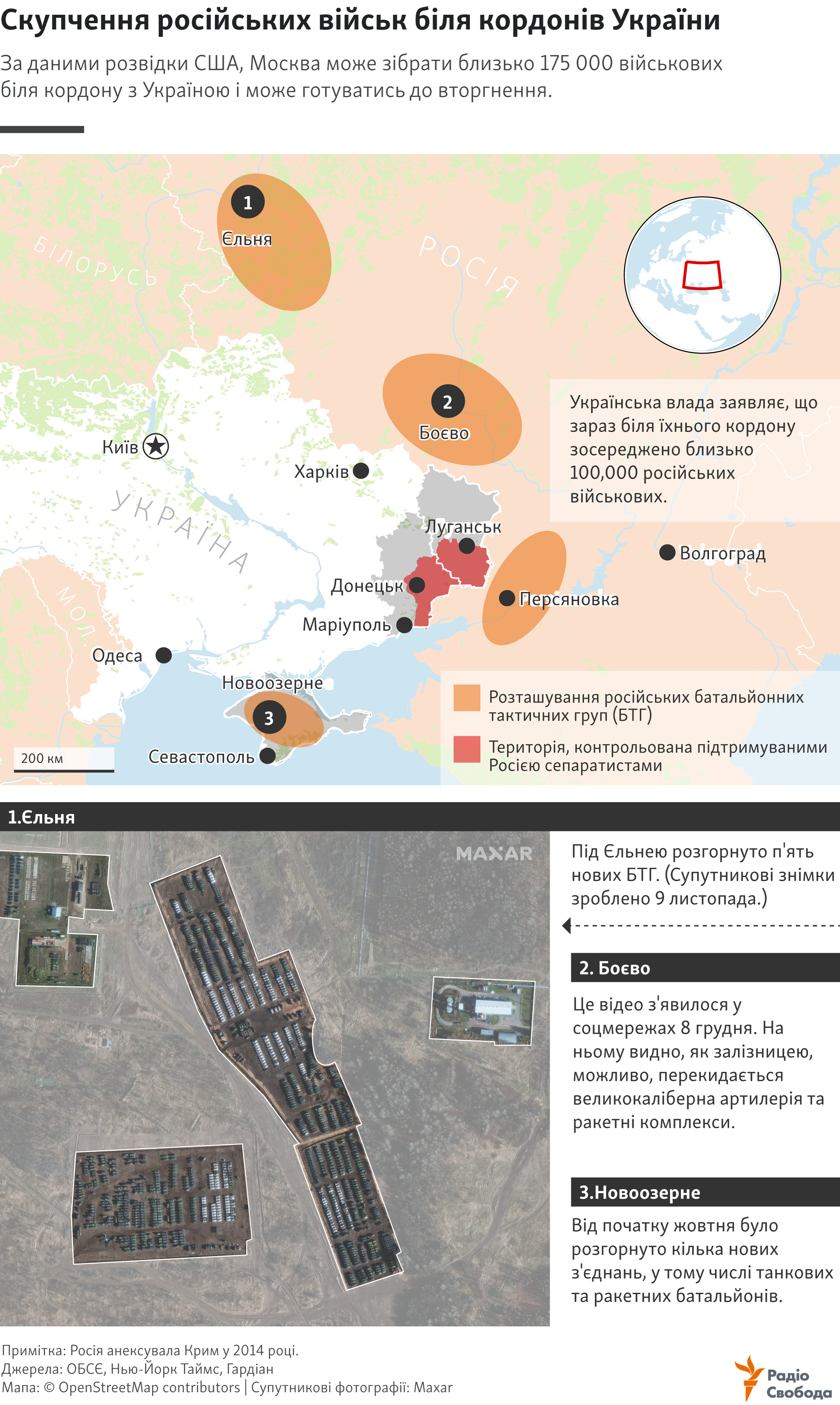 Информация из открытых источников, включая спутниковые снимки, показывают, что Россия развертывает оборудование и вооружение, которые позволят совершить сильную атаку, если будет отдан приказ. Например, по неподтвержденным данным, на железнодорожных платформах перевозили экскаваторы для рытья траншей, направлявшиеся в направлении украинской границы, а также зенитно-ракетные комплексы «Бук М-1».