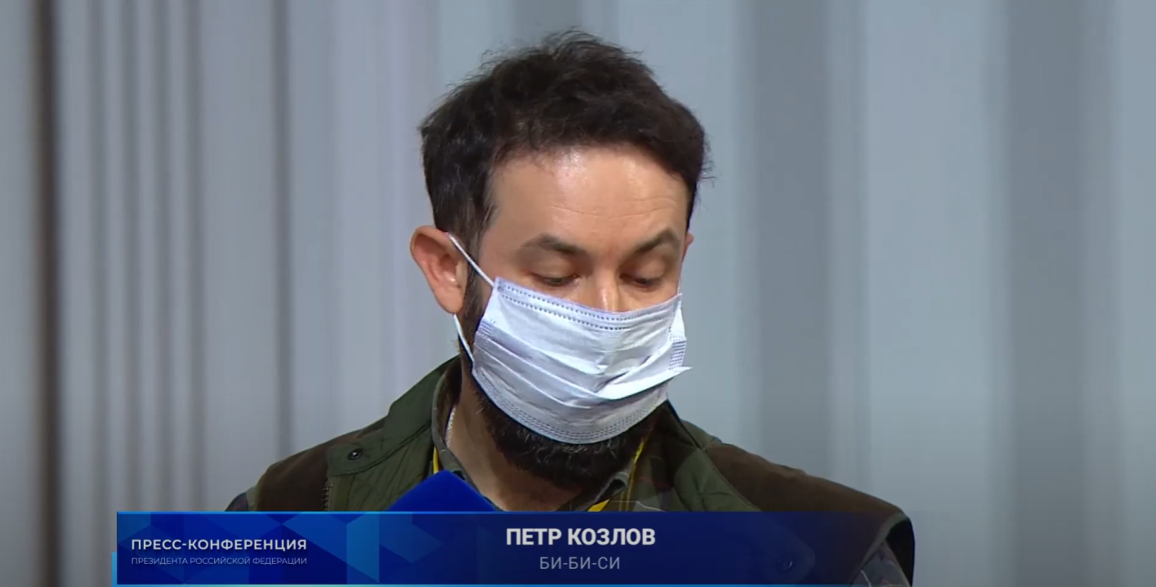 Пришел Дмитрий Песков. Напоминает о необходимости соблюдать «социальную дистанцию», менять раз в 1,5 — 2 часа маски и выключить телефоны. Обещает, что «набалдашник для микрофона» (ветрозащита) будет для каждого задающего вопрос новым. Рекомендует представляться тем, кого он не знает лично, и быть краткими.
