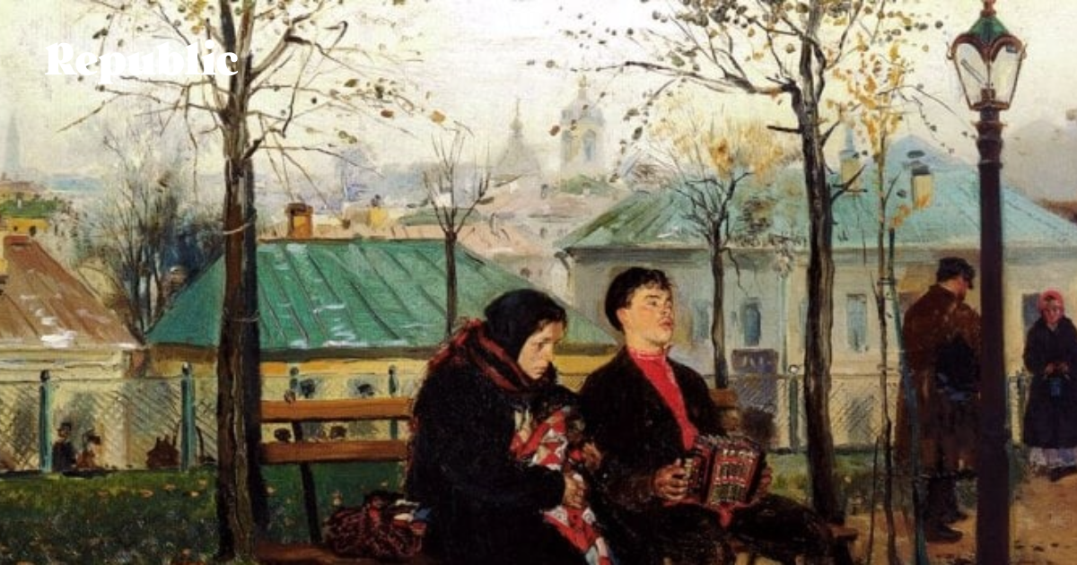 Бытовая сценка. Молодая деревенская пара в воскресный день (у парня выходной и он одет в праздничную красную рубаху) сидит в большом городе (очевидно, это Москва) на бульваре. Проводят время вместе, развлекаются игрой на гармошке. Мы видим, что они вместе, видим, что одеты празднично, видим, что парень играет на гармошке, но ни праздника, ни развлечения, ни даже совместности тут совсем никакой нет. А есть только тотальная непроходимая разобщенность и отчужденность. Всего и вся. Отчужденность их друг от друга. Их отчужденность от окружающего города. Даже от своей гармошки парень глубоко отчужден…
