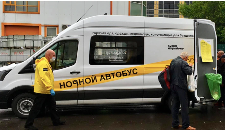 «Ночной автобус» — проект «Ночлежки», в рамках которого волонтеры ездят и раздают нуждающимся еду, одежду и средства гигиены. В столице «Ночной автобус» отправляется от Ленинградского вокзала, его маршрут заканчивается в Восточном административном округе рядом со МКАД.