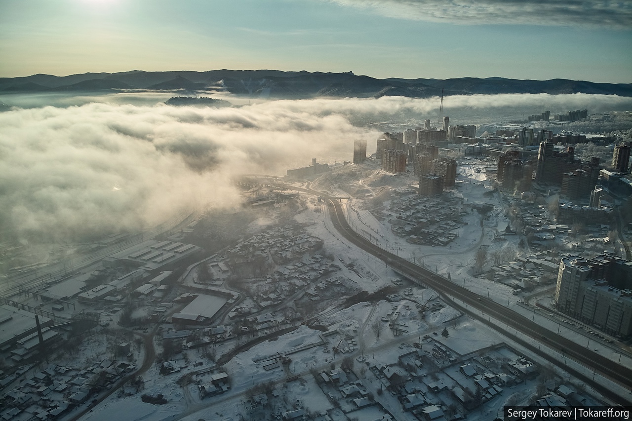 Кадры смога над Красноярском удалось запечатлеть оператору «ТВК Красноярск» Сергею Токареву. На них дымка будто окутывает город.