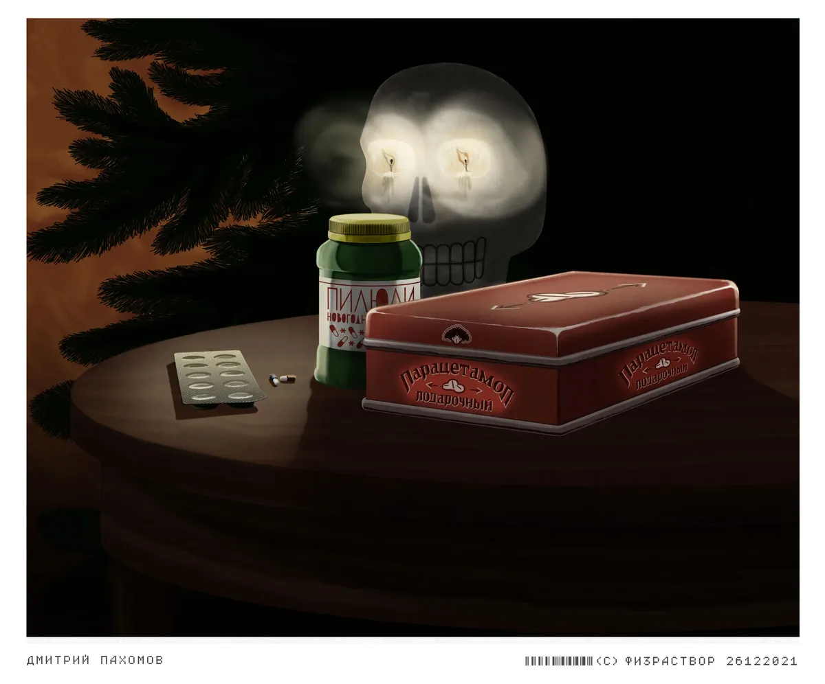 Праздничный натюрморт с парацетамолом и пилюлями от коронавирусной инфекции нового типа.