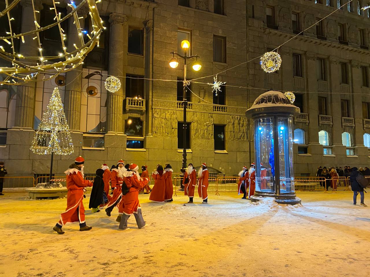Вечером 26 декабря в Петербурге прошел забег Дедов Морозов. Колонна людей в костюмах стартовала на Дворцовой площади и двинулась по центральным улицам. «Бумага» показывает, как прошла акция в минус 16 градусов.