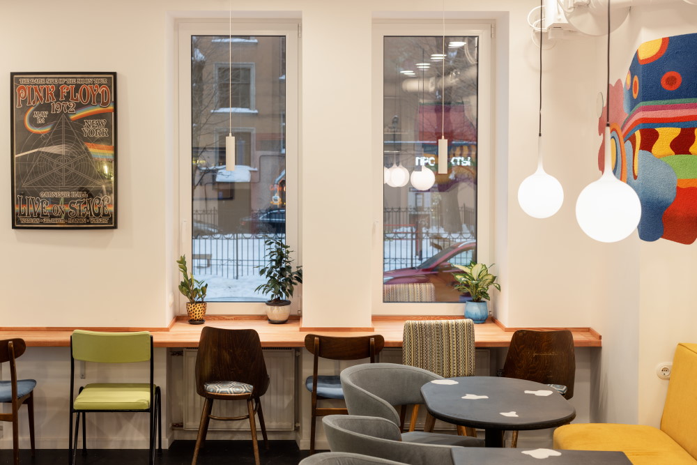 Помещение оформили в стиле 60-х годов XX века: пространство украсили постерами Pink Floyd, а на одной из стен можно увидеть арт, вдохновленный лондонской улицей Карнаби.
