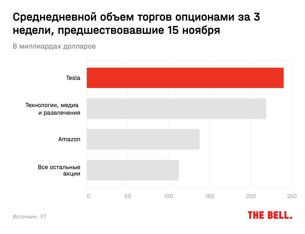 Активность инвесторов на рынке опционов сосредоточена в нескольких компаниях. В ноябре ежедневный объем торгов опционами, привязанным к акциям Tesla, составлял $241 млрд, Amazon — $138 млрд, писал FT со ссылкой на данные Goldman Sachs. Для сравнения, для остальных акций из индекса S&P 500, вместе взятых, этот показатель составлял $112 млрд.