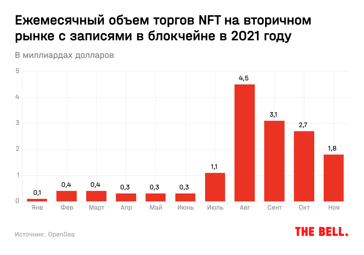 Огромная ликвидность, которую за время пандемии привнесли центральные банки, ожидаемо стала просачиваться и на другие рынки. Ежемесячный объем торгов NFT (невзаимозаменяемых токенов) на вторичном рынке, хоть и снизился с пиков в августе, все равно продолжает оставаться крайне высоким. Как пишет Fortune, по оценке компании DappRadar, общая стоимость всех NFT в мире составляет $23 млрд — это больше, чем стоят, к примеру, Nissan и Domino’s Pizza.