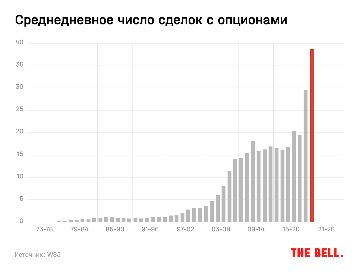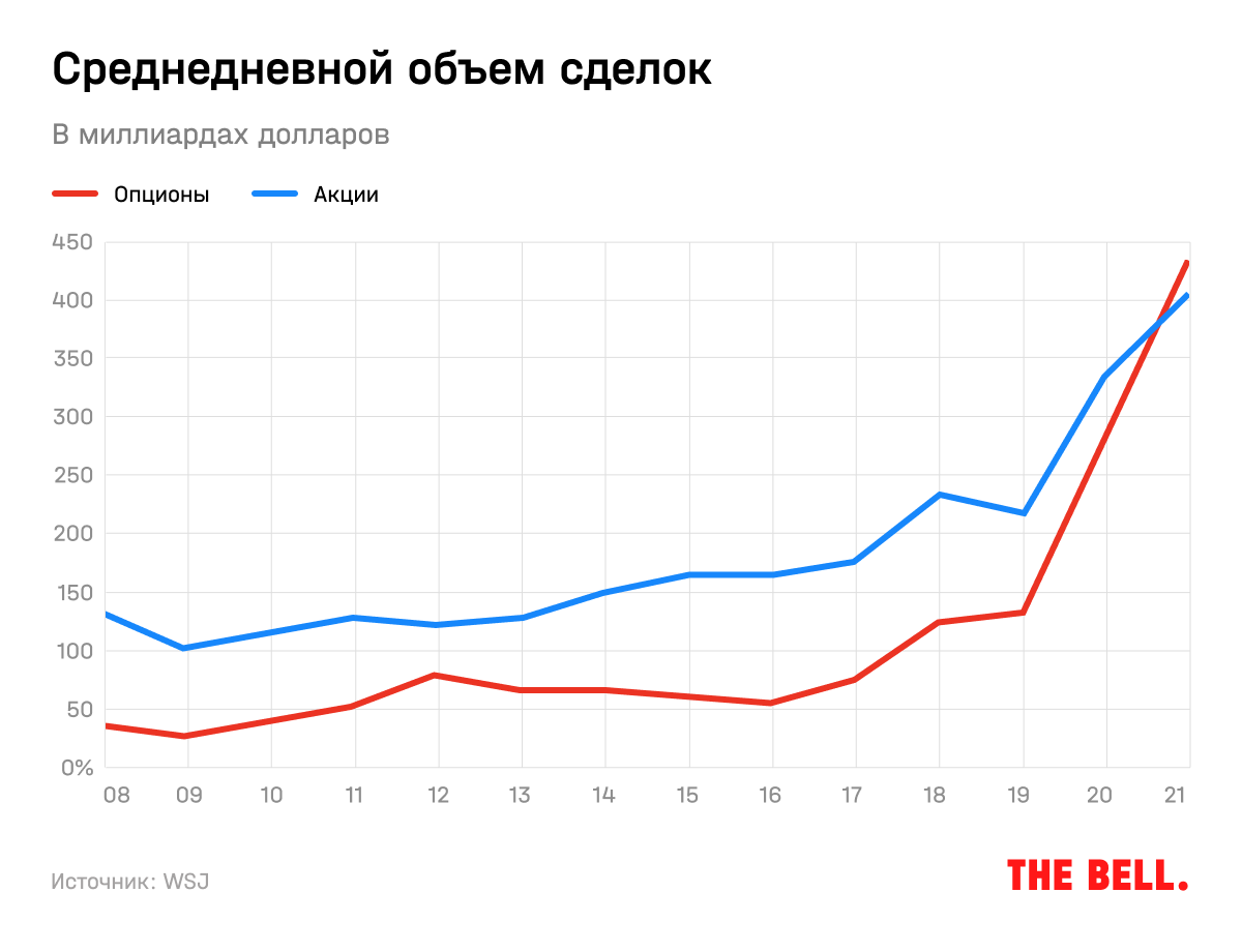 В 2021 году в США каждый день в среднем 39 млн опционов меняли своих владельцев — на 35% больше, чем год назад, пишет WSJ со ссылкой на данные Options Clearing Corp. Это самый большой показатель за всю историю существования рынка (с 1973 года). И около четверти всей активности приходится на частных инвесторов, хотя раньше их использовали в основном профессионалы для хеджирования рисков, отмечал WSJ.