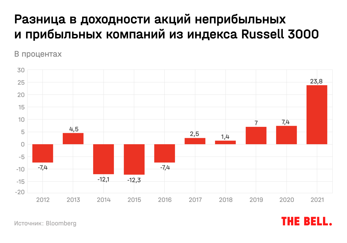В этом году отстающую динамику показывают в первую очередь не акции роста (в конце концов к ним относятся и бигтехи), а акции неприбыльныхкомпаний, среди которых много бумаг роста. По подсчетам Bloomberg на конец ноября, прибыльные компании из индекса Russell 3000 показали среднюю доходность в 36% — в три раза больше, чем неприбыльные. В последний раз прибыль давала такую премию в 2002 году — после того как лопнул пузырь доткомов, напоминает Bloomberg.