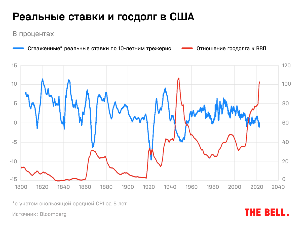 Самое интригующее из возможных объяснений этому явлению дает финансовый историк Джим Рид, работающий на Deutsche Bank. Он свел на одном историческом графике отношение госдолга США к ВВП за более чем 200 лет и заметил, что настолько низкими, как сейчас, реальные (то есть с учетом инфляции) ставки были только три раза в истории: во время Гражданской войны, после Первой и Второй мировой войн. Все эти эпизоды сопровождались резким ростом госдолга из-за увеличения расходов.