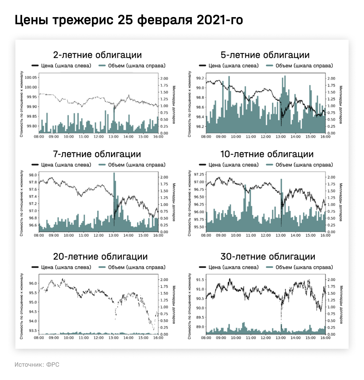 Аукцион по размещению трежерис обычно привлекает внимание только профессионалов — но 25 февраля 2021 года стало исключением. Спрос на 7-летние облигации на крупнейшем и самом ликвидном рынке суверенных бондов тогда оказался на самом низком уровне в истории, пишет Financial Times. Издание даже включило этот аукцион в список главных событий года. Случившееся затронуло весь долговой рынок: цены по 5-, 7- и 10-летним казначейским облигациям резко упали и частично восстановились примерно через час. ФРС потом назовет это flash event.