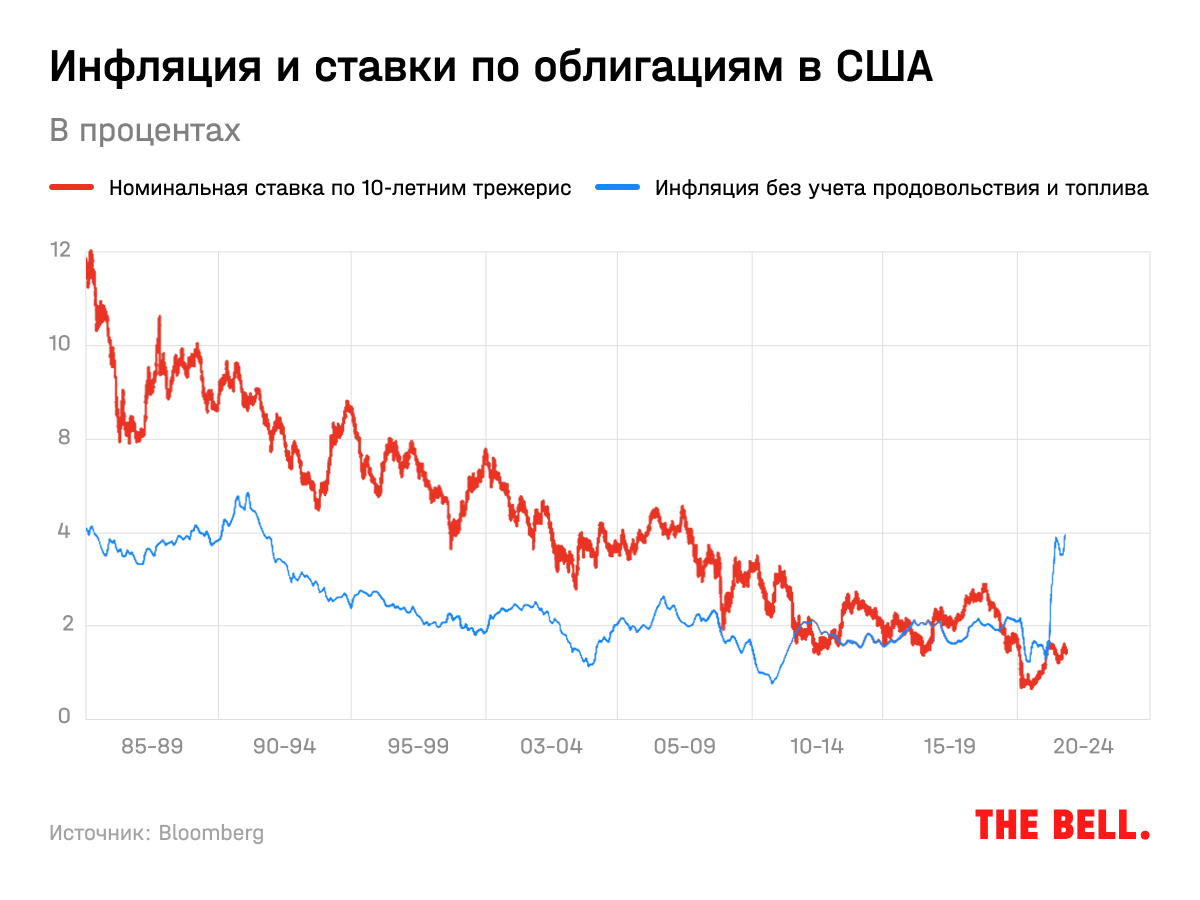 Одна из главных загадок на рынке — почему ставки не растут вслед за инфляцией. Раньше они двигались вместе: чем выше инфляция, тем больший процент должны требовать инвесторы за вложения в облигации, напоминает Bloomberg. Но даже угроза ужесточения денежно-кредитной политики в 2022 году не заставила ставки сильно сдвинуться с места — с конца ноября ставки по 10-летним трежерис «заякорились» около 1,45% годовых.