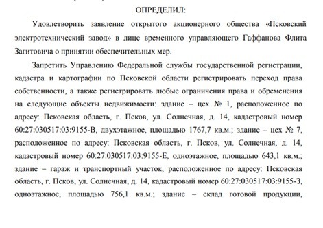 Представители завода «Зенча-Псков» назвали «полностью искажённой и абсолютно недостоверной» информацию о том, что, несмотря на решение суда, в 2015 году здание завода на улице Солнечной было продано собственникам АО «Зенча-Псков». Но это так: 13 мая 2014 года судья Арбитражного суда Псковской области Манясева приняла обеспечительные меры и запретила продавать имущество завода. Однако уже в 2015 году имущественный комплекс получил новый собственник.