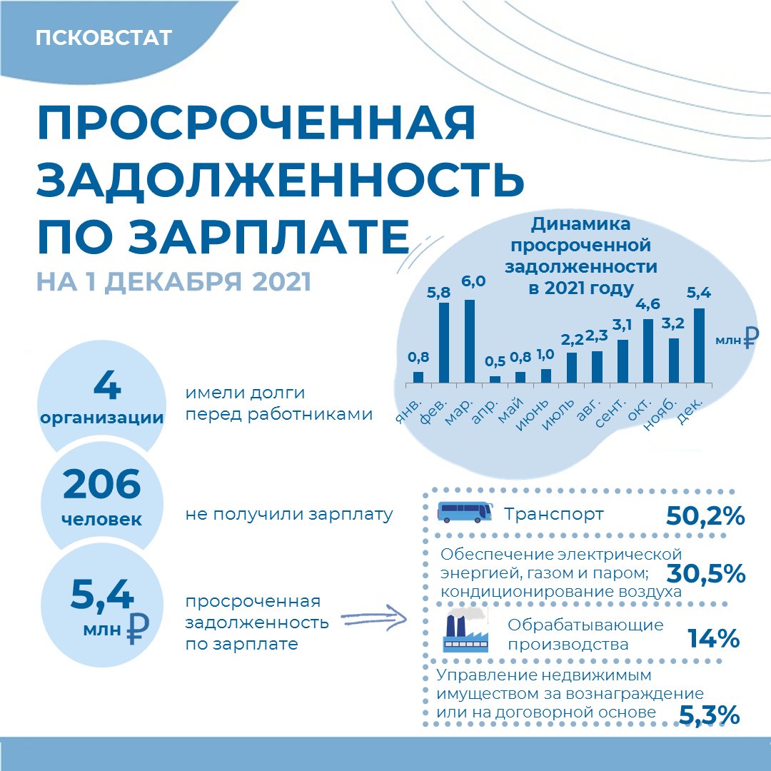 Просроченная задолженность по зарплате в Псковской области за месяц выросла на 72 процента и по состоянию на 1 декабря 2021 года составила 5 млн 428 тысяч рублей: по данным Псковстата, это на 2 млн 273 тысячи рублей больше, чем на 1 ноября 2021 года.
