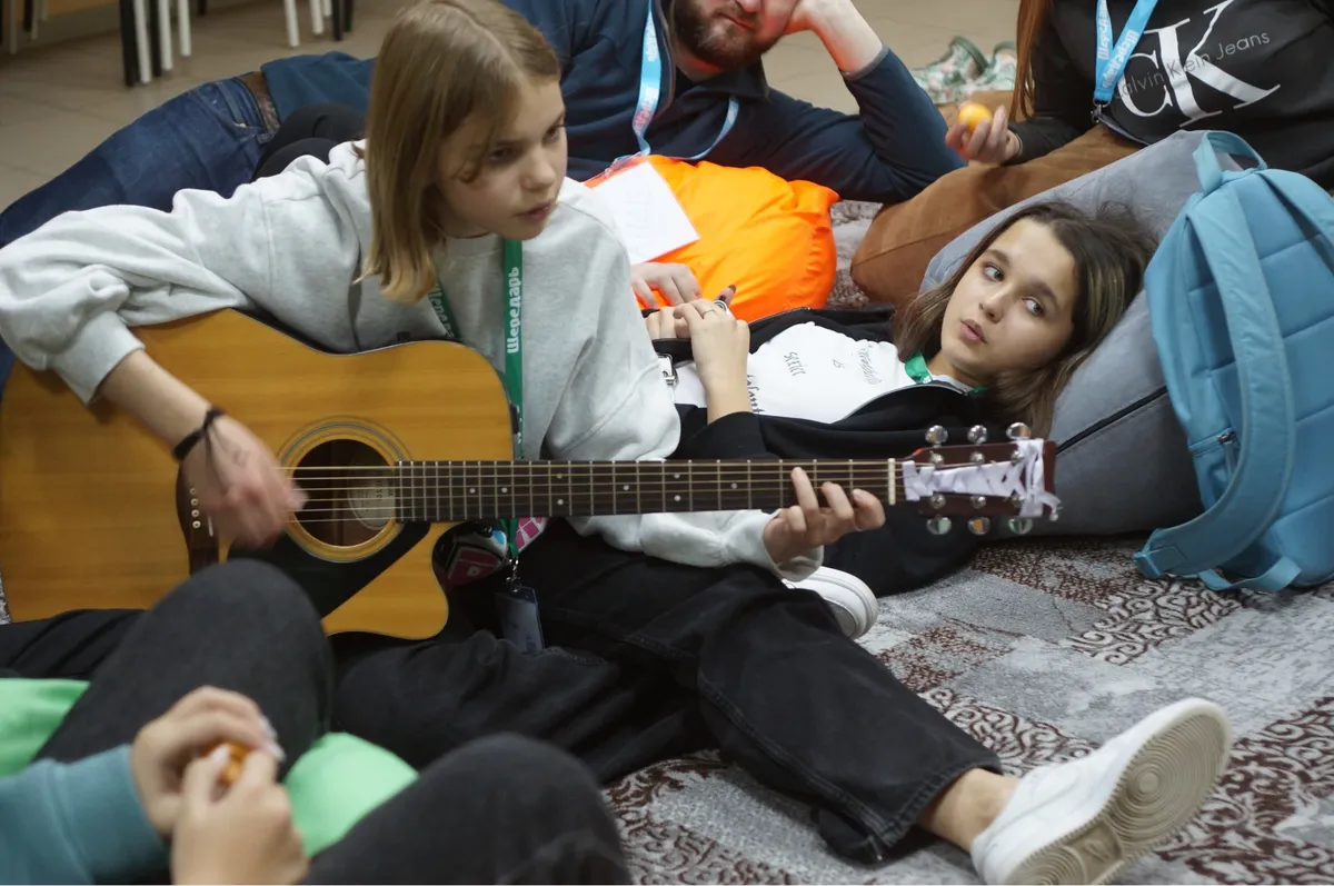 — Например, вон там лучше всего релакс — можно поваляться, чаю попить, потупить в мультики, фильмы, а там — поиграть. Можно порепетировать в концертном зале, а здесь — помузицировать, — объясняет мне волонтер, или шери (так их здесь называют), Леша Шульга. Последней фразы он мог бы и не произносить, потому что музицирования не заметить сложно — волонтер в шляпе показывает ребятам, как играть на барабанах, и они самозабвенно по ним стучат.