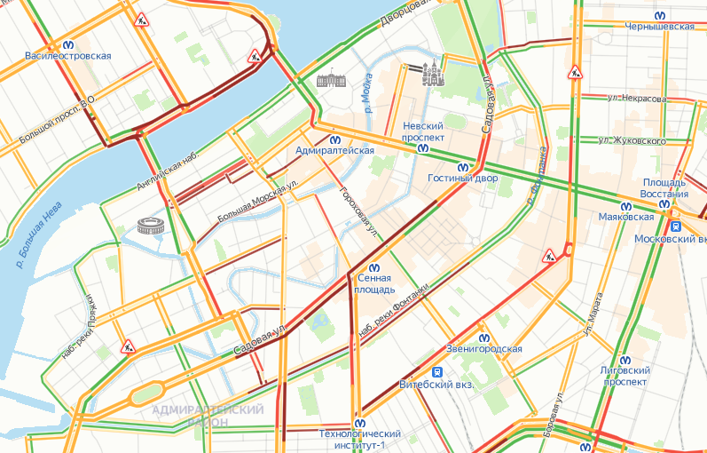 По состоянию на 11:30 сервис «Яндекса» фиксирует в Петербурге пробки в 7 баллов. Наиболее напряженная дорожная обстановка наблюдается в центре города, а именно на Университетской и Дворцовой набережных, в районе Исаакиевского собора, на Садовой улице и Невском проспекте.