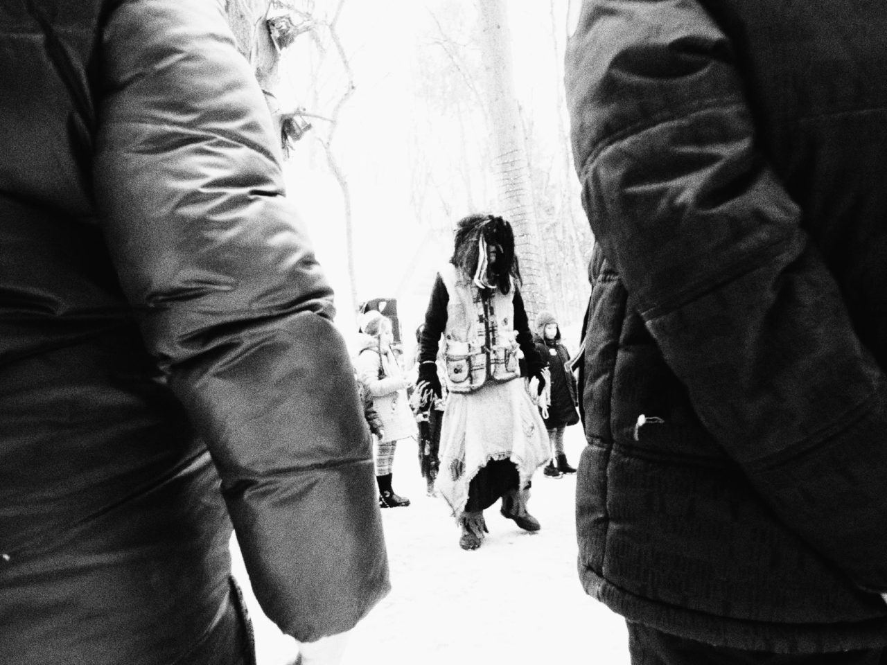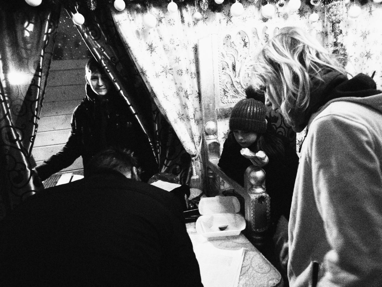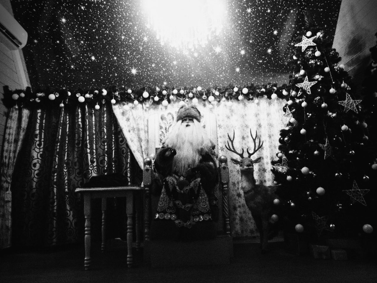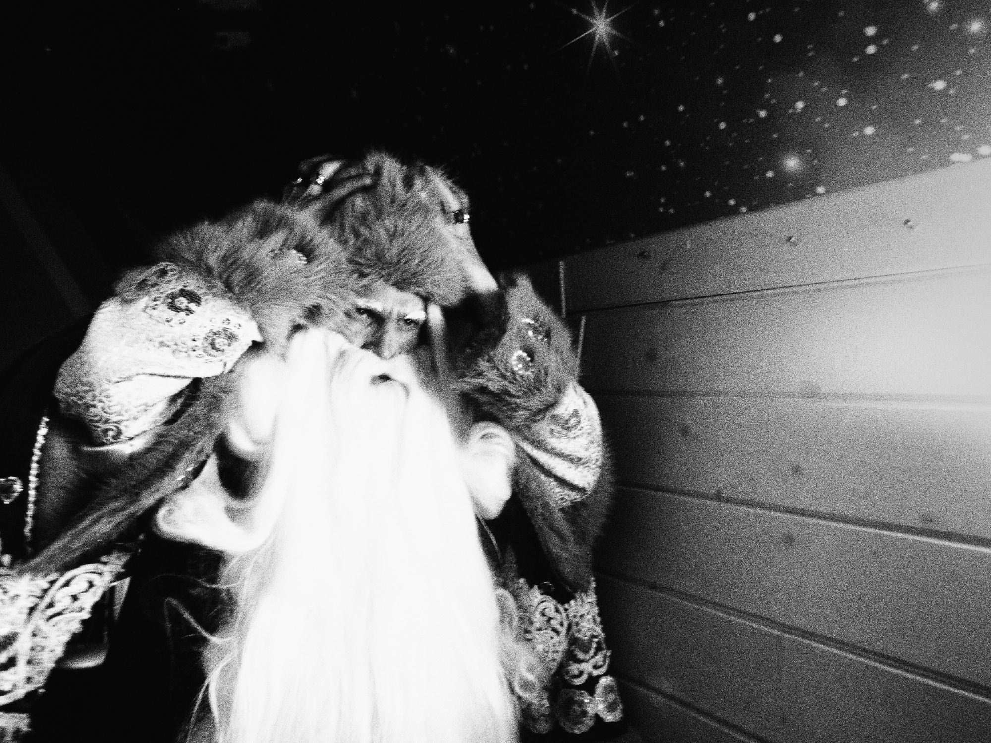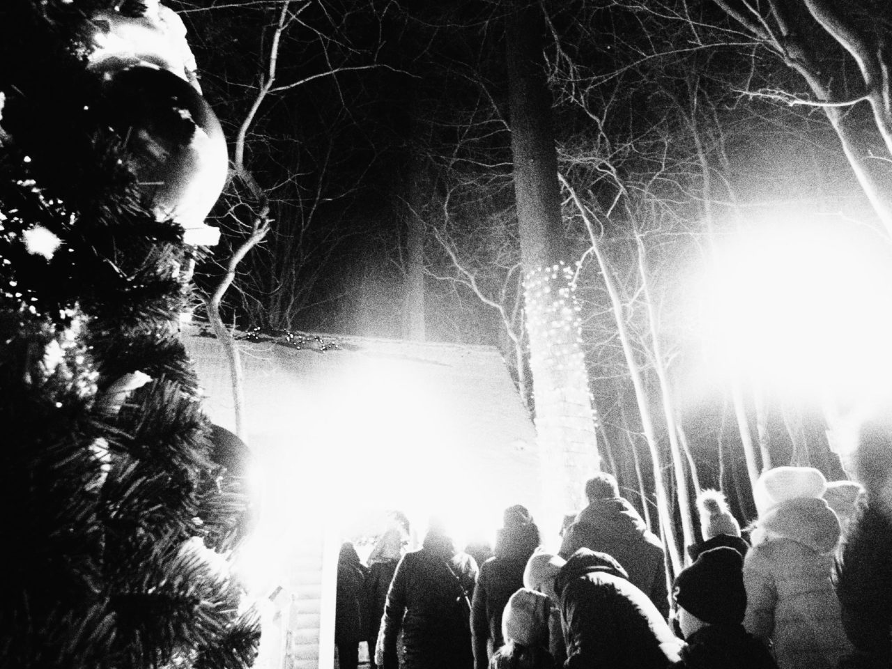 Андрей Турицын скрылся за синим серебристым пологом и вернулся уже в облике Деда Мороза. Костюм его был украшен янтарем и стразами — все это переливалось в свете электрических свечей и гарантировало чудо.