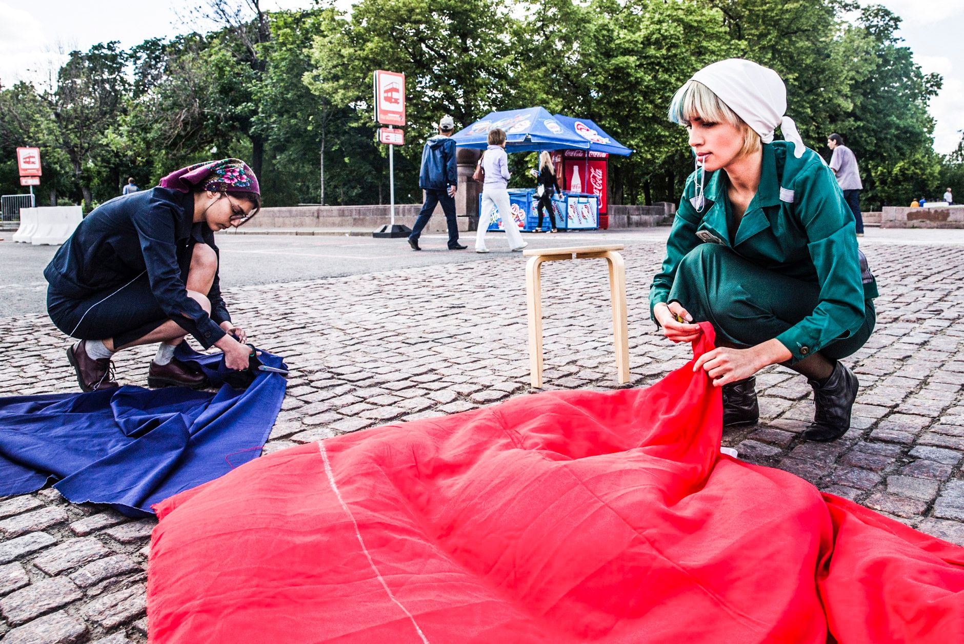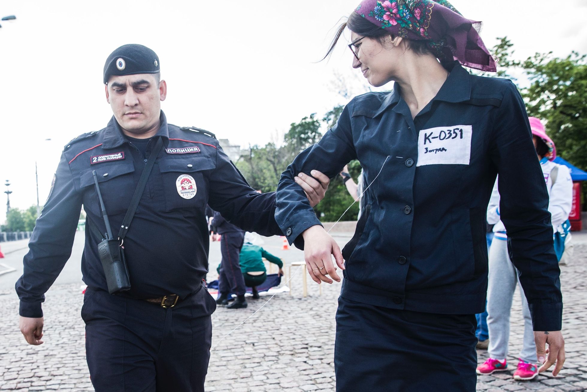 Независимо от Алехиной акции проводила и Надежда Толоконникова — например, в День России, 12 июня 2015-го, в одежде заключенной попыталась сшить флаг России на Болотной площади в Москве. Ее и художницу-акционистку Катрин Ненашеву, также участвующую в акции, задержали.