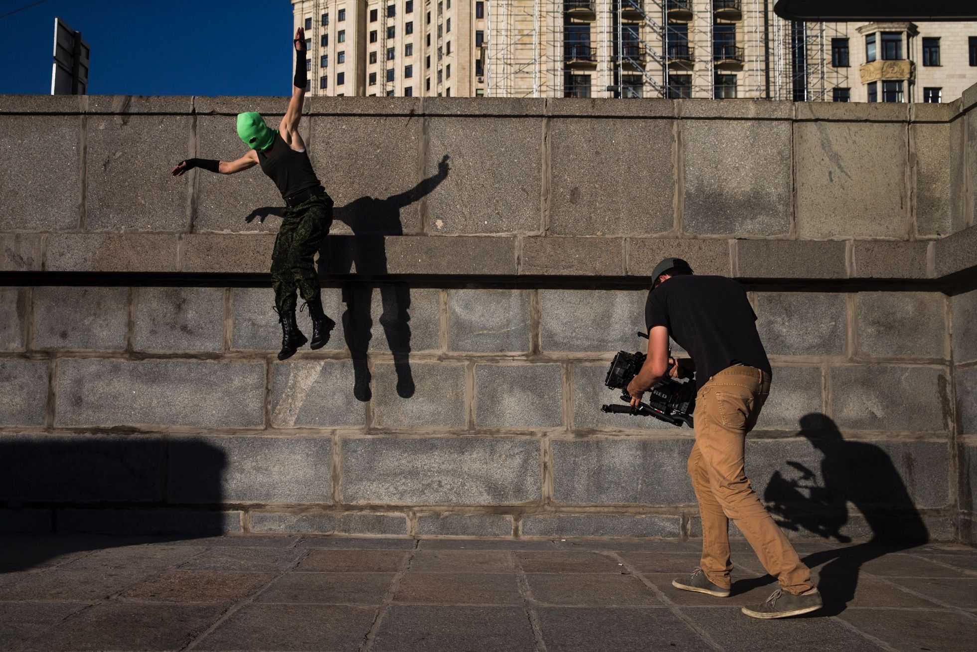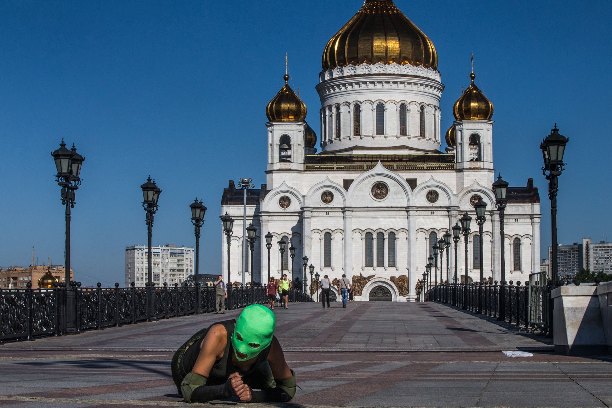 Евгений Фельдман Надежда Толоконникова в балаклаве на фоне Храма Христа Спасителя. Сцены из невышедшего клипа на совместную песню с Томом Морелло. 2015 год