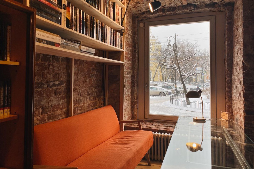 — Вместительное пространство с минимальной отделкой. Голый кирпич и мебель, проверенная временем. Барная стойка напротив открытой кухни в едином светлом стиле. Одинаковые ряды окон по двум сторонам, хаотичная рассадка, зоны для танцев, концертов и кинопоказов.