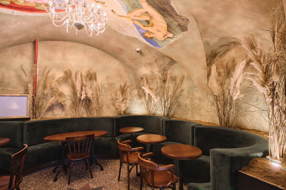 Ресторан занял четыре зала в историческом здании, рассчитанные на 144 посадочных места. Пространство оформили в стиле эклектики: атмосферу европейских палаццо объединили с деталями, присущими британским пабам. На стенах вывесили арт-объекты, интерьеры разных залов отличаются друг от друга.