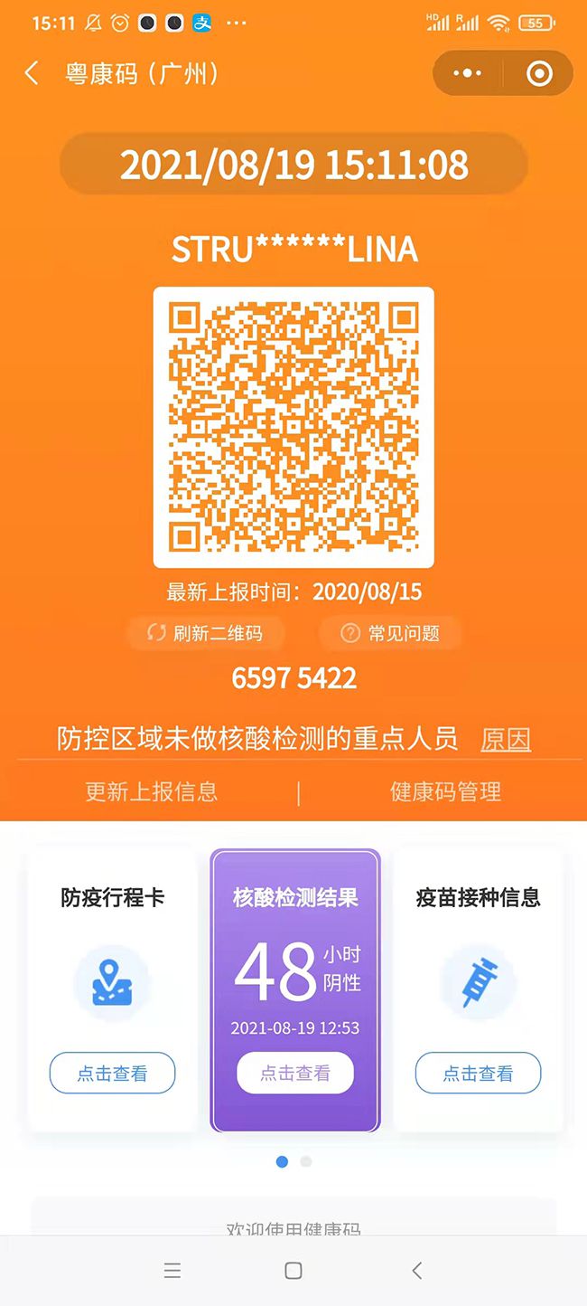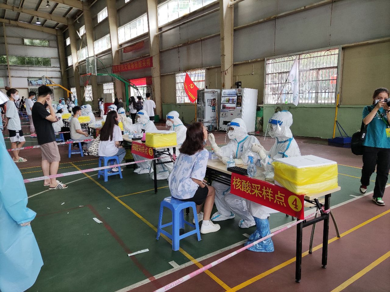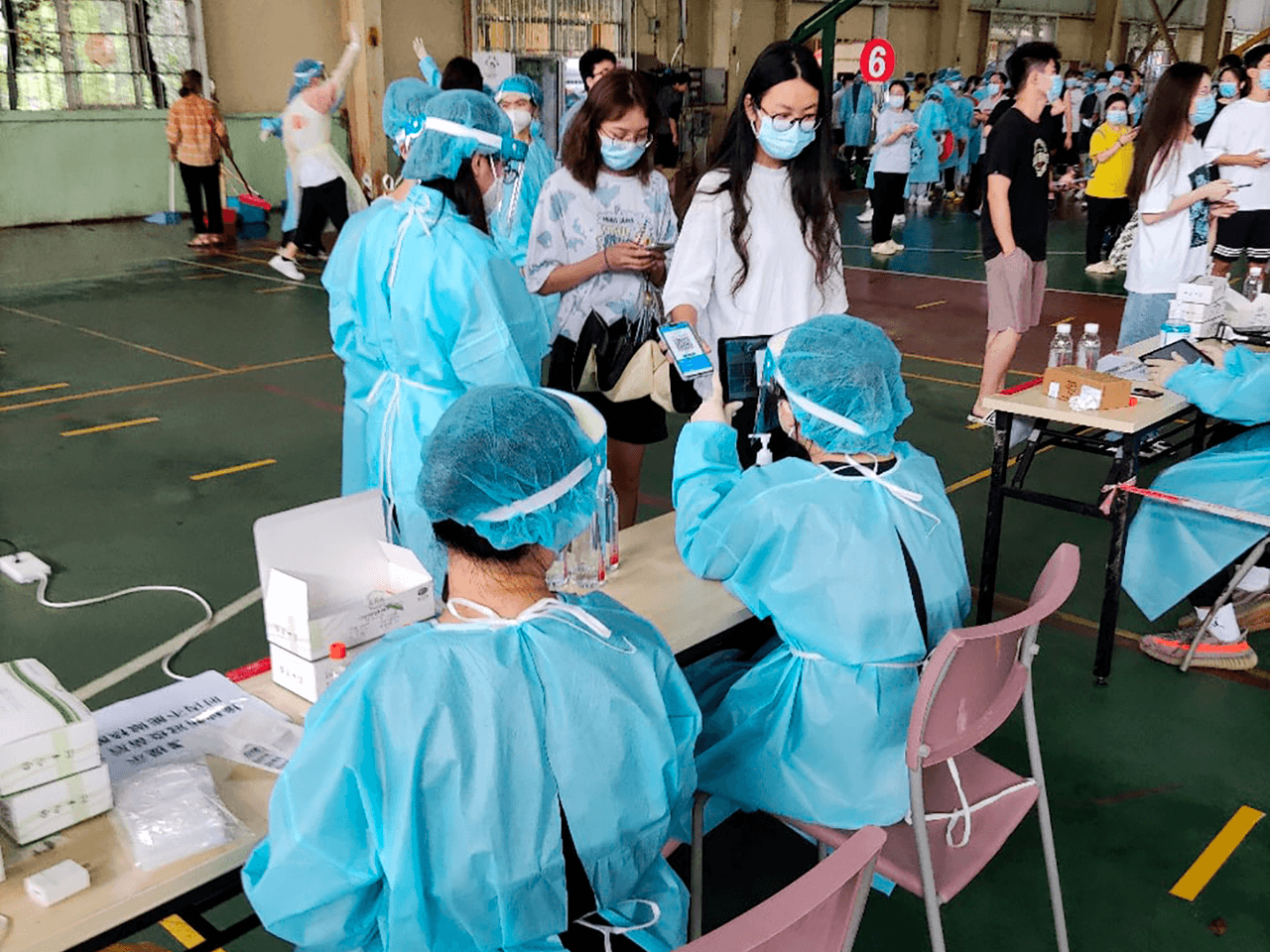 Такая схема тестирования едина для всех городов и районов Китая. Вначале экстренно проверяют всех людей, находящихся в эпицентре заражения. Если выявляются новые случаи, то район закрывают и всех проверяют снова через несколько дней. Если новых случаев не выявлено, то всё равно через несколько дней проводят повторное тестирование. Район выводят из изоляции минимум через 14 дней с момента обнаружения последнего случая. Те, кто пропустил тест, получают жёлтый код здоровья и вынуждены его сдать. А если явиться на тест не получилось по каким-то объективным причинам, то врачи придут на дом. Впрочем, такие случаи единичны. Само настроение общественности, солидарность и массовость как бы подталкивают к сдаче теста во что бы то ни стало. «Вместе — вирус победим!» — подобные лозунги можно увидеть на красных растяжках во дворах и в парках, где ставят врачебные палатки. Даже сезон ливней в Гуанчжоу не останавливал. В любом случае у местной полиции всегда есть списки жителей микрорайонов по прописке, поэтому отлынивать бесполезно.