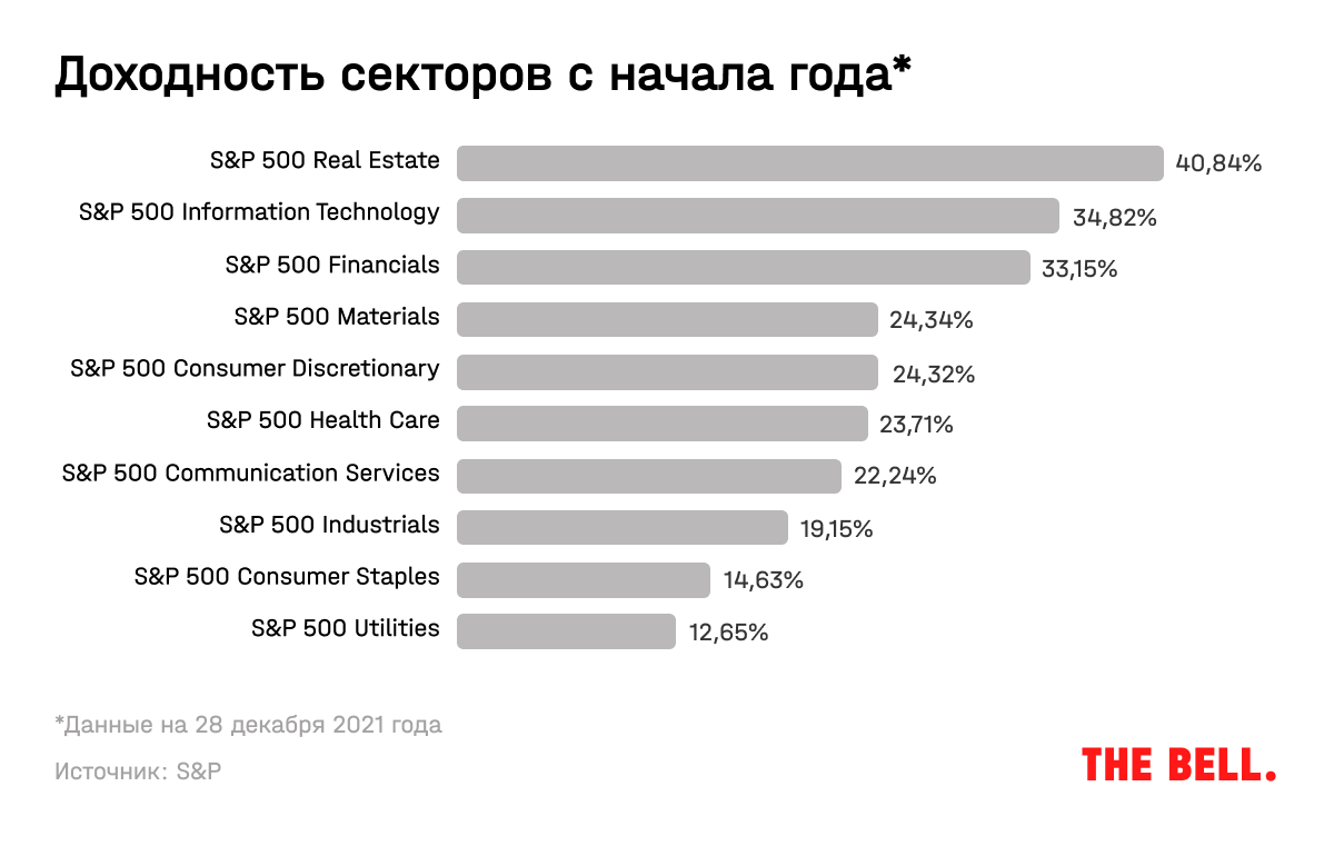 Все сектора индекса S&P 500 в 2021 году показали двузначную доходность, в том числе благодаря росту операционной рентабельности компаний, пишет Bloomberg. Самую высокую доходность показал энергетический сектор благодаря восстановлению спроса и росту цен на нефть. «Защитный» сектор коммунального хозяйства показал наименьшую доходность.