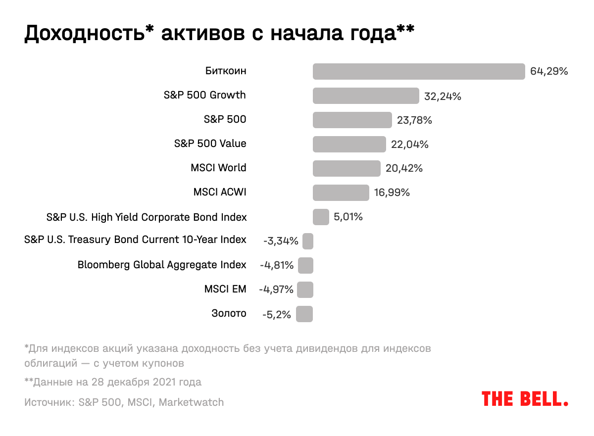 2021 год принес инвесторам неожиданно высокую доходность: индекс S&P 500 — главный мировой бенчмарк рынка акций — завершил год на уровне 4766 пунктов, хотя в начале года наилучший прогноз на Уолл-стрит составлял 4400 пункта. Рассказываем, какие классы активов, рынки и стратегии принесли наибольшую доходность и почему.