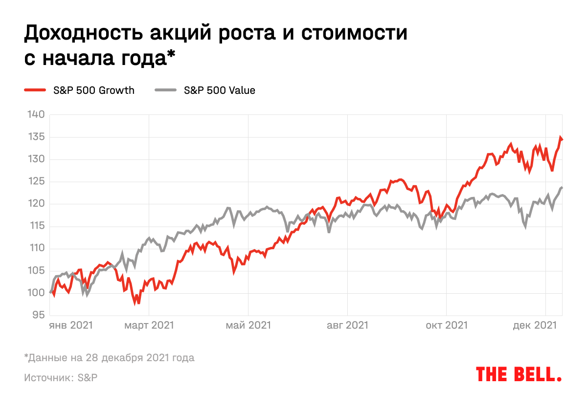В 2021 году на доходность влиял и размер компании, считает Morningstar. Индекс Morningstar американских компаний малой капитализации с начала года вырос на 14,1%, крупной — на 24,8%. Во втором полугодии, когда аппетит инвесторов к риску снизился, акции технологических гигантов выступили в роли прокси-облигаций, отмечает Хари Раманан, главный инвестиционный директор исследовательских фондов Neuberger Berman.