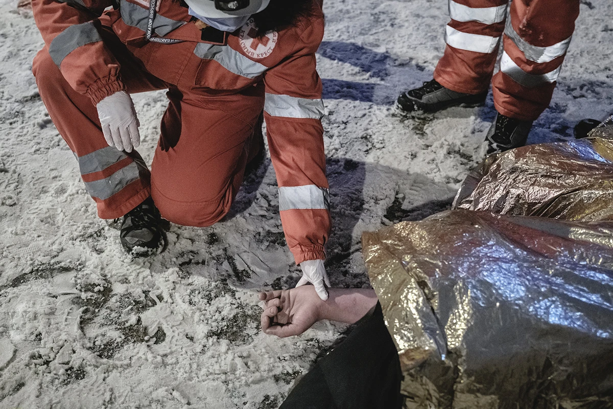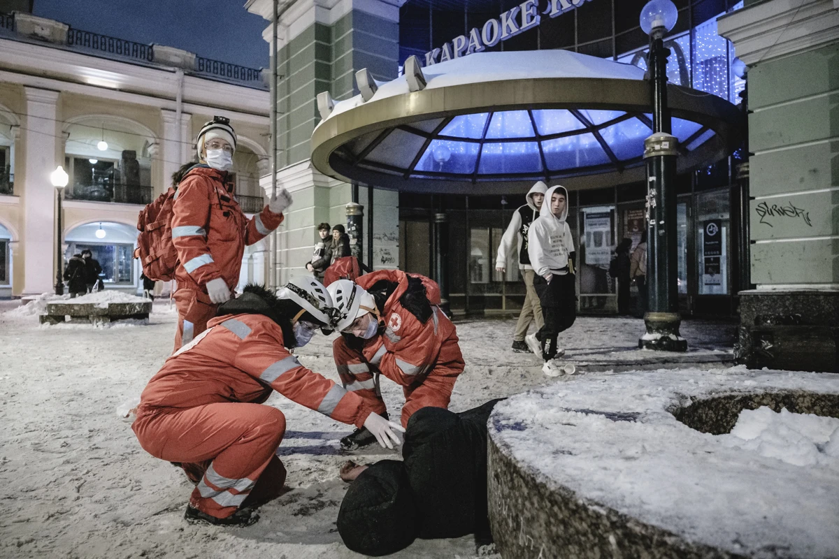 Первого пострадавшего в группе Астры замечают на улице. Мужчина без сознания лежит на ледяной гранитной плитке. Полицейские уже вызвали скорую. Волонтеры заворачивают пострадавшего в термоодеяло, периодически проверяют его состояние.