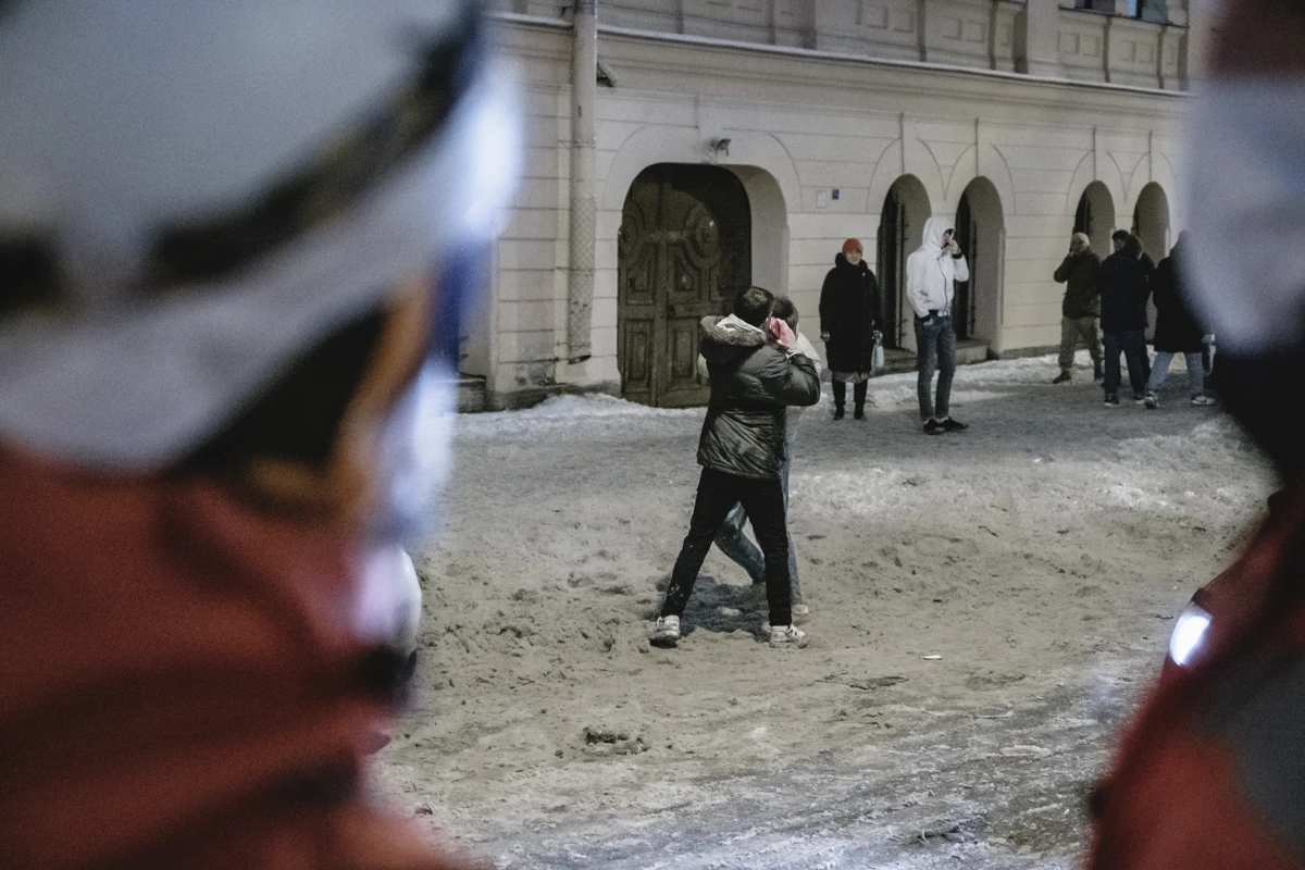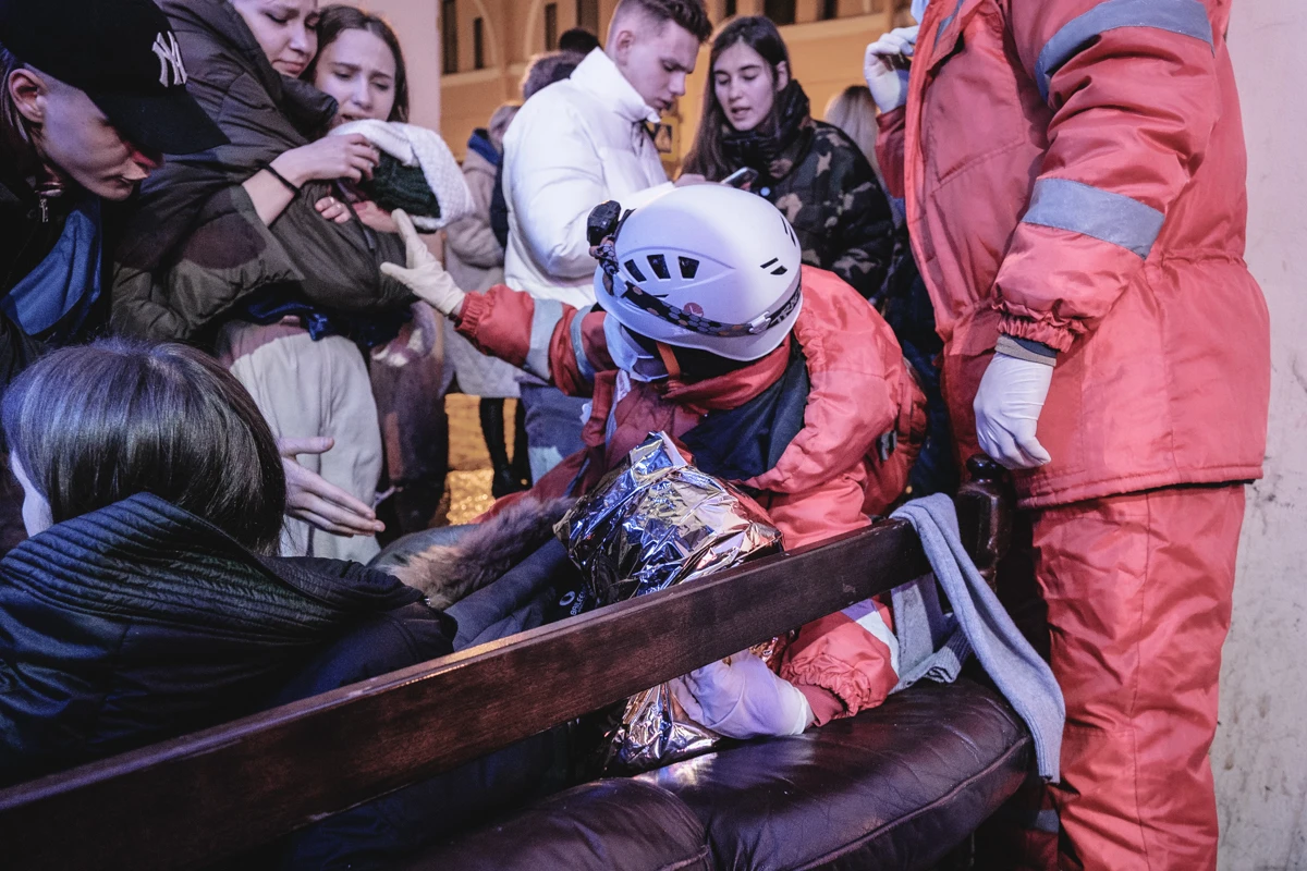 На Ломоносовской — в эту улицу упирается Думская — к Альме и Энкилу подбегает женщина и зовет их к ближайшему бару — она заметила, как на улице потеряла сознание девушка. Пострадавшую волонтеры находят в слякоти у проезжей части, доносят до дивана, стоящего на улице у бара, укрывают термоодеялами.