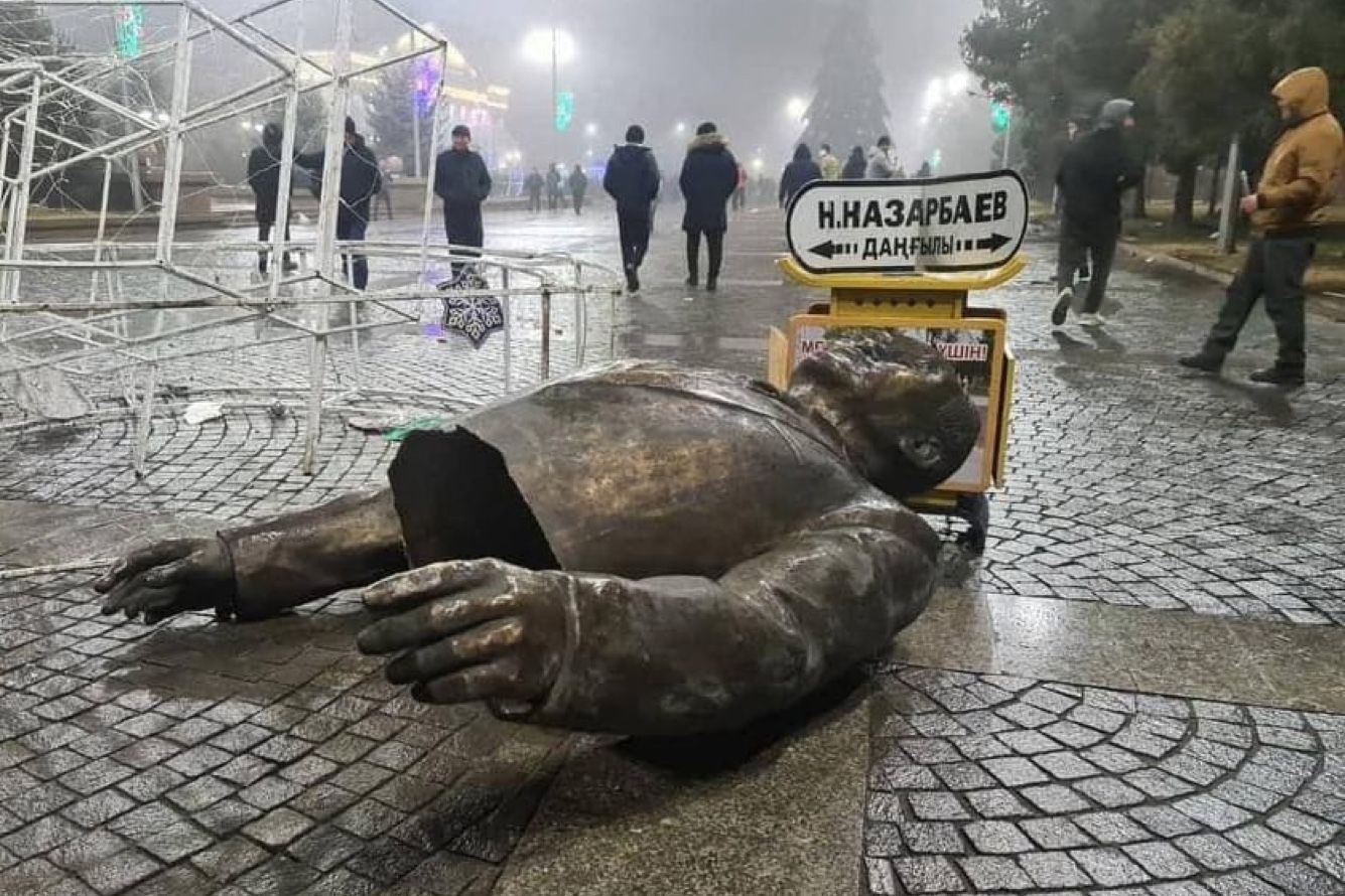 Telegram channel Ateobreaking Protesters in the city of Taldykorgan tore down a monument to Kazakhstan’s first president, Nursultan Nazarbayev, on Wednesday, January 5. This happened shortly after President Kassym-Jomart Tokayev announced in a nationwide address that he has removed Nazarbayev from his lifetime post as chairman of the nation’s Security Council. Nazarbayev has yet to speak publicly about mass protests against suddenly doubled fuel prices.