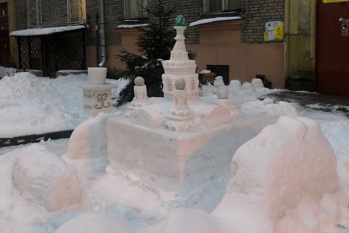 Во дворе жилого дома у «Черной речки» заметили снежную миниатюру Спаса на Крови. Судя по всему, ее выполнил Владимир Кузьмин, который создает подобные скульптуры с 2010 года. «Бумага» писала об увлечении пенсионера и публиковала фотографии его работ.