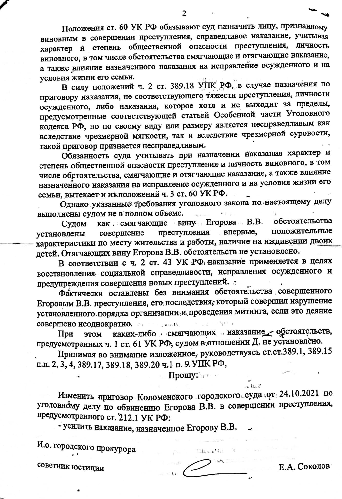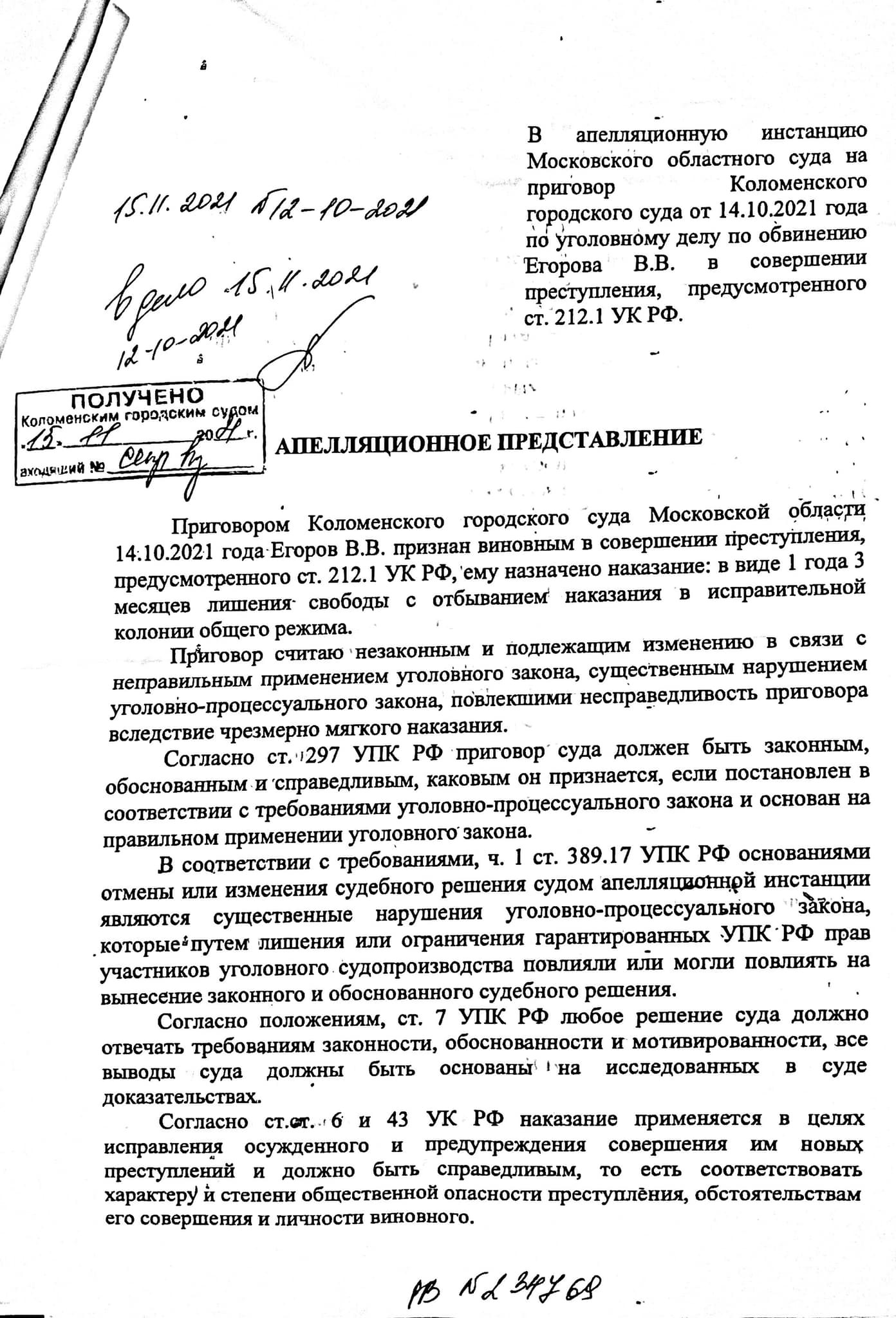 Письмо пришло из Коломенского городского суда с представлением прокурора на приговор активисту Вячеславу Егорову