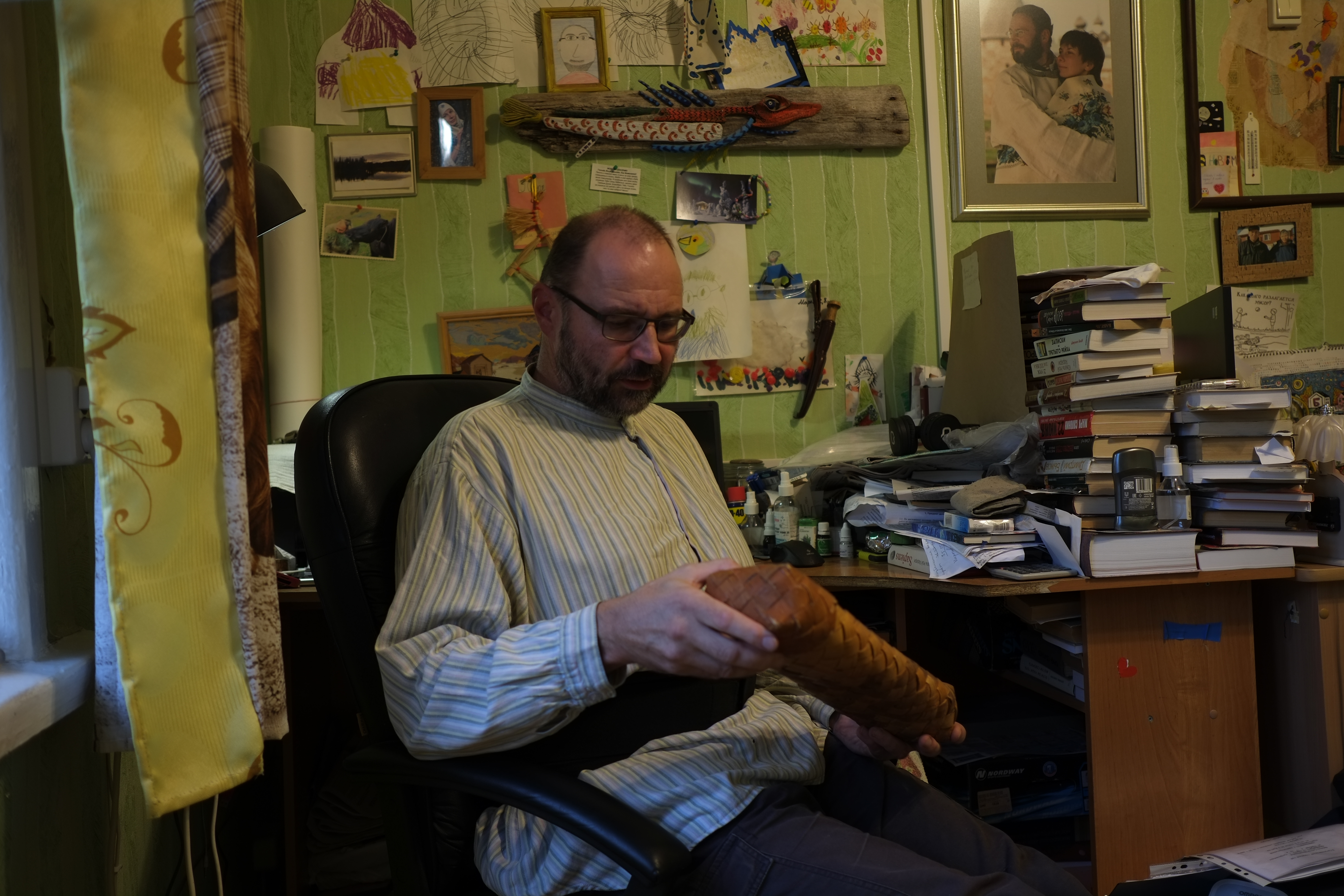 Слева от Филенко сложены какие-то куски бересты, справа – сделанные из неструганных досок полки в стиле рустик модерн, на полках шкатулки, кузова, фигурки и коробы из лыка, фотографии дочери и жены. Дочь любит слушать рассказы Филенко о первых часах ее жизни – Сергей присутствовал на родах.